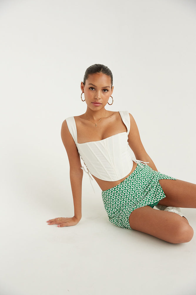 Make a scene in the Kiko Corset Crop Top! Featuring a square neckline, a curved hem, lace up sides for a glimpse of skin, and inner boning for a corset look. Available in black and white. Pair with some for the ultimate summer look!