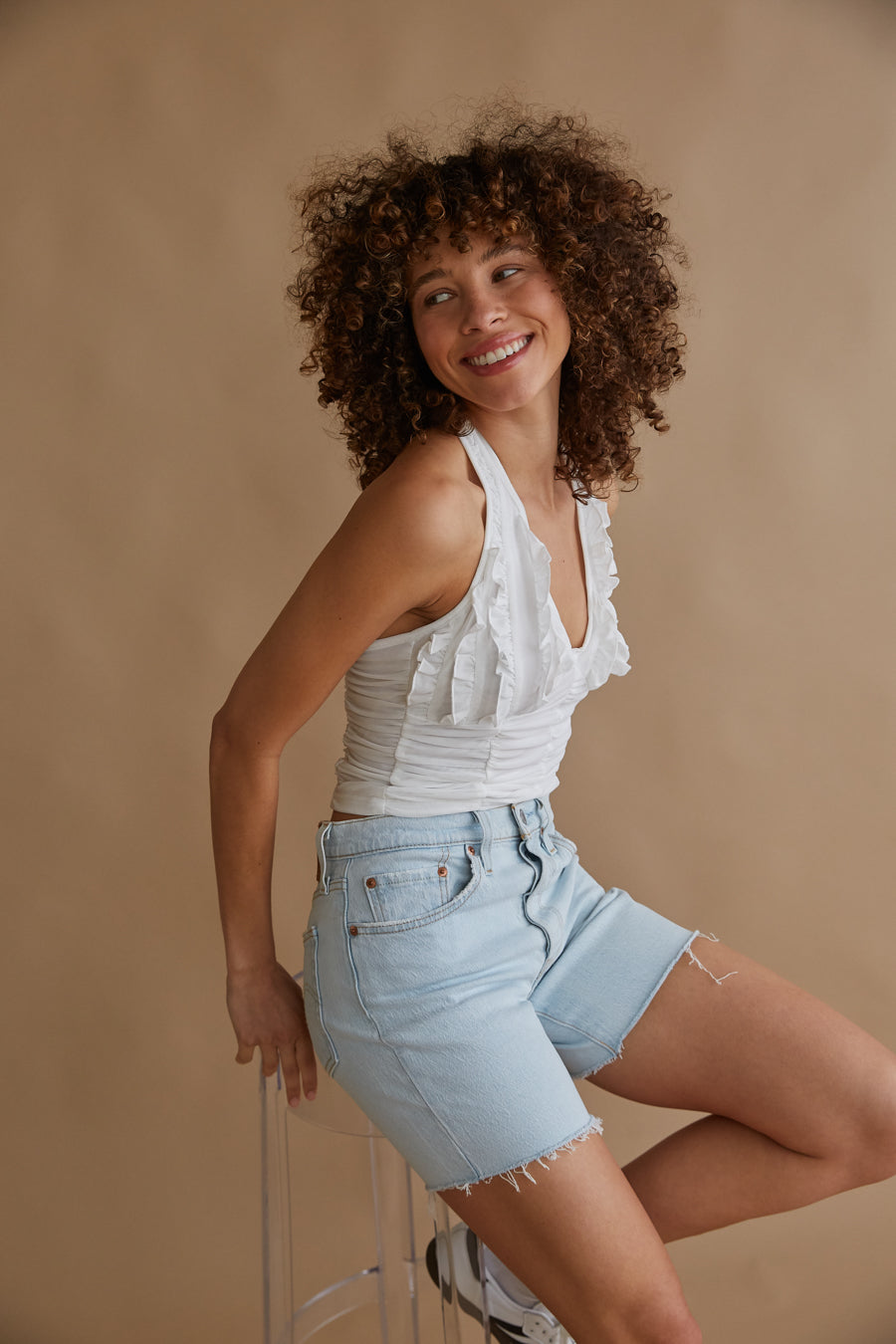 The Leona Mesh Ruffle Halter Top is a spring and summer must-have! This cute top features an adjustable tie halter neckline, ruffle trimmed panels on the bust, and a ruched bodice. to complete the look!