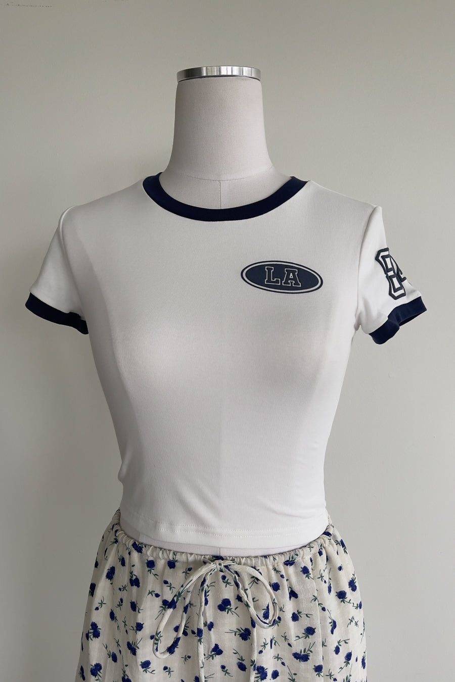 Spend Summer as a certified cool girl in the Margot LA Puff Print Baby Tee! This trendy baby tee features an LA emblem and 84 sleeve detail. With navy trim accents and a snug cropped fit, this baby tee is super versatile! Pair this baby tee with the to complete the outfit!