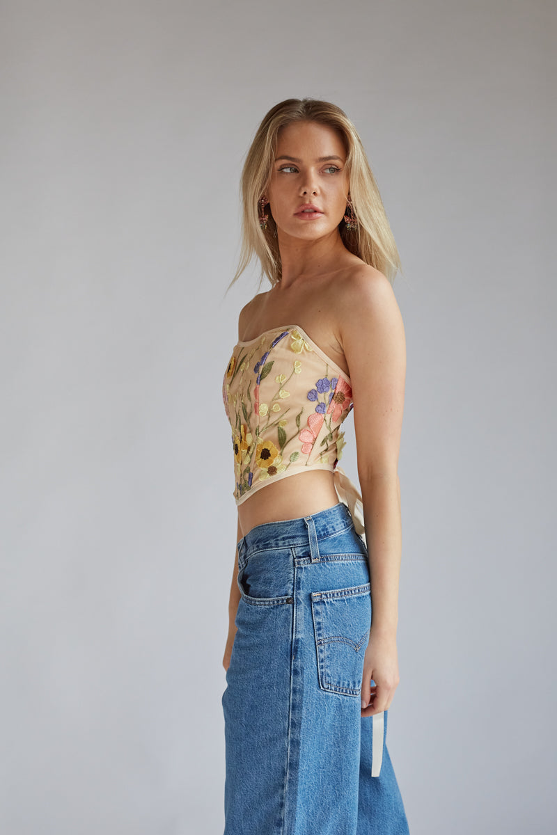 Get ready for spring in the Marigold Strapless Floral Lace Corset Top! This beautiful top features a feminine floral embroidered lace overlay, a strapless neckline, lace up ribbon back with silver grommets, and a curved hem. Pair with some to complete the look!