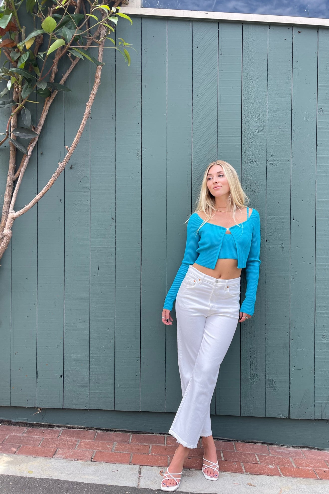 The Marina Ribbed Cami Crop Top features a soft ribbed knit fabric and a V-neckline. Available in blue. Wear this top with the matching for the perfect fall look!