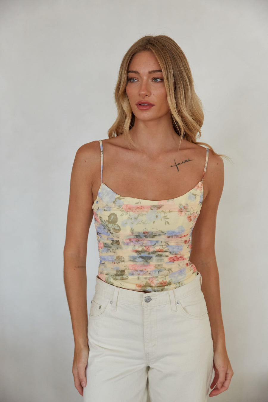 Fit for a daydream, the Penelope Ruched Floral Mesh Top is the perfect Summer corset top! Featuring all over ruching, pointed neckline, and dreamy mesh draping, this floral top is beyond elegant! Pair with your favorite for a casual Summer outfit!