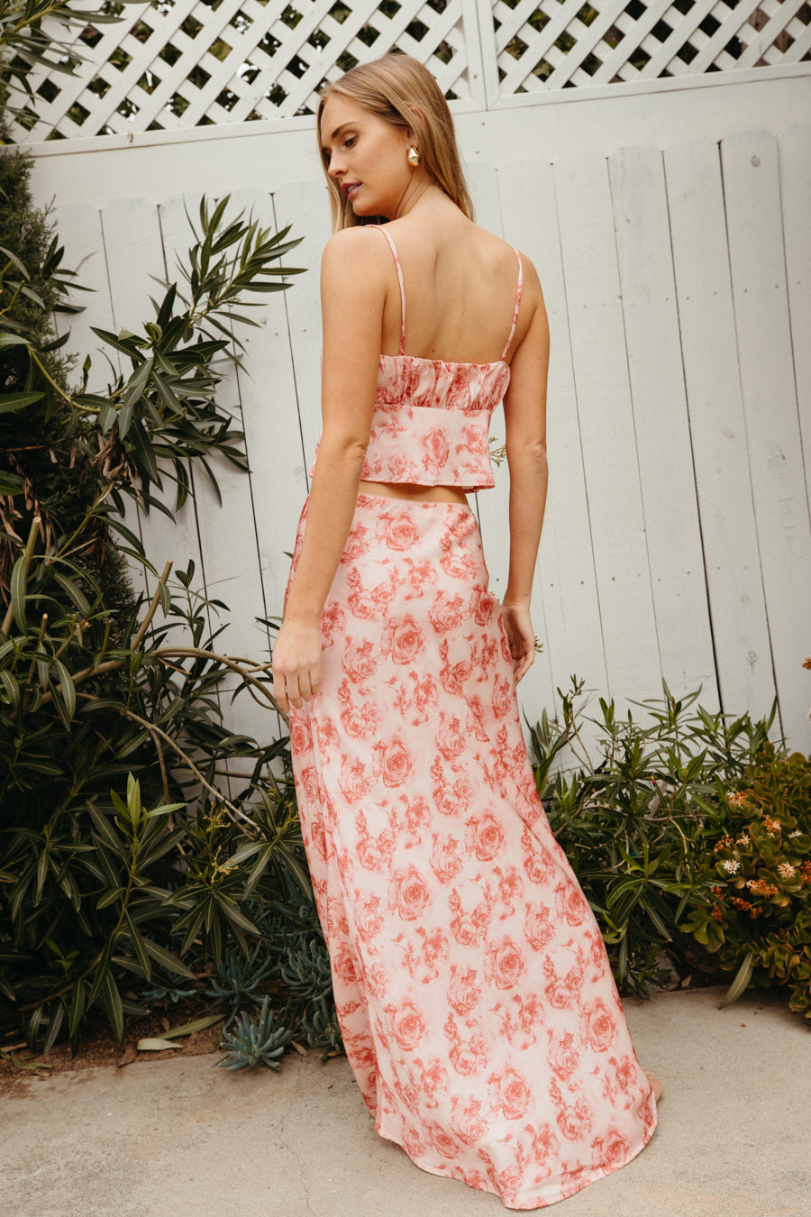 Charm them in the Rosetta Floral Satin Maxi Skirt! This beautiful skirt is made of a satin material and features a maxi length and drawstring waist with an eyelet lace trim. Pair with the matching to complete the look!