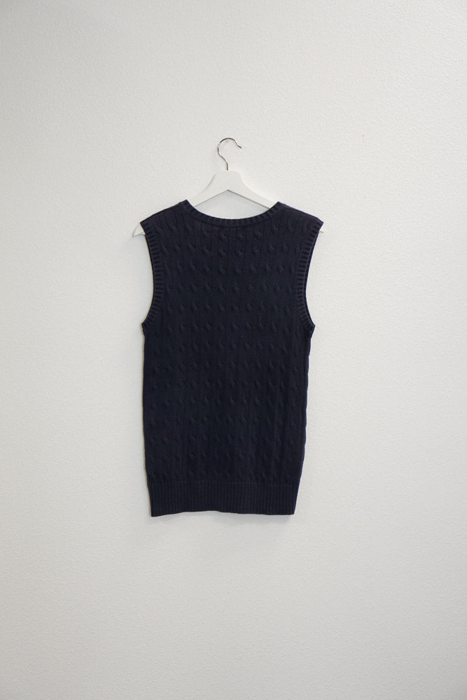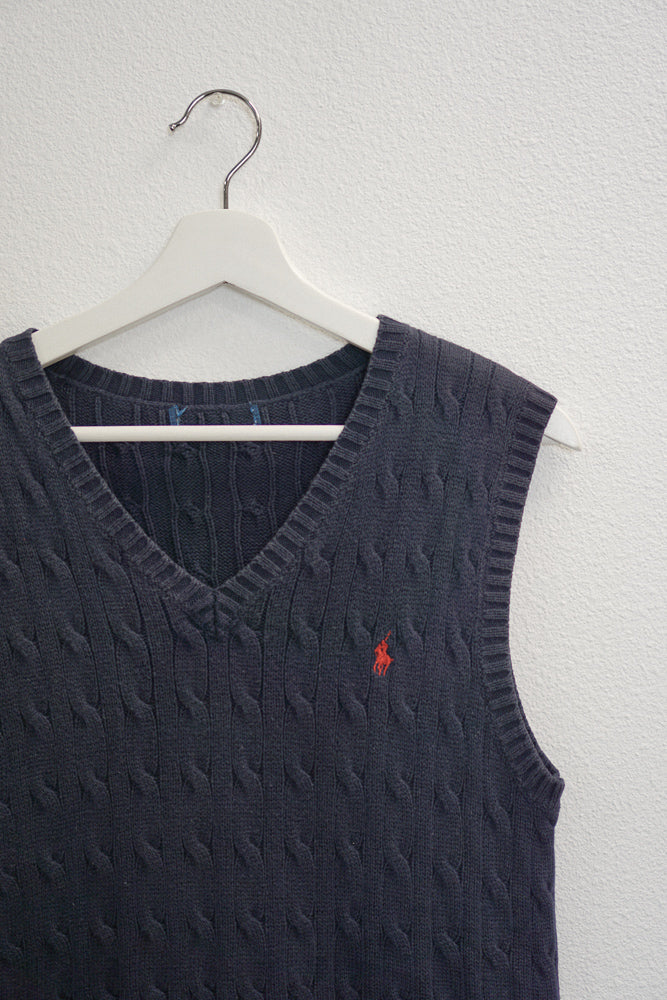 Fall in love with the Scout Polo Sweater Vest. Featuring a boxy silhouette, cable knit design, and embroidered Ralph Lauren logo. Available in navy.