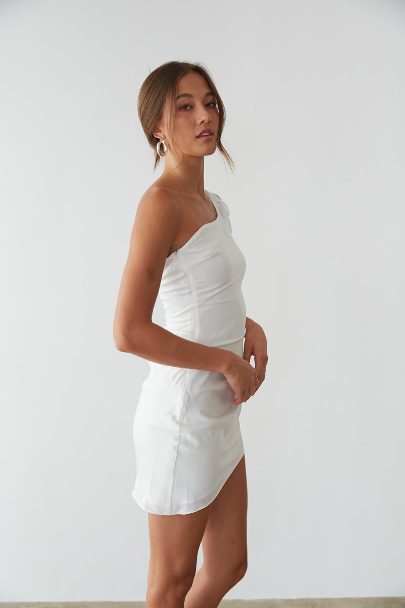 Slip into the Sonia Draped One Shoulder Asymmetrical Mini Dress for the perfect party look! This stylish mini dress is complete with an asymmetrical hem and one shoulder strap with a draped fabric detail. Available in black and white. Finish off the look with your favorite !