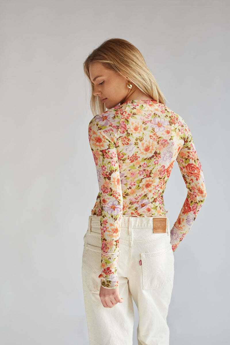 Feel feminine and flirty in the Summer Floral Mesh Long Sleeve Top! This gorgeous top is made of a semi-sheer mesh material and features a colorful floral print, long sleeves, a crew neckline, and a lettuce cut hem and cuffs. Pair with a cute pair of to complete the look!