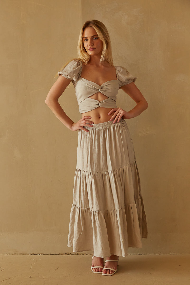 Make everlasting memories in the Topanga Twist Front Crop Top! This crop top features and double twist front design with a cutout below the bust, puff sleeves, and a smocked stretchy back. Pair with the matching to complete the set!